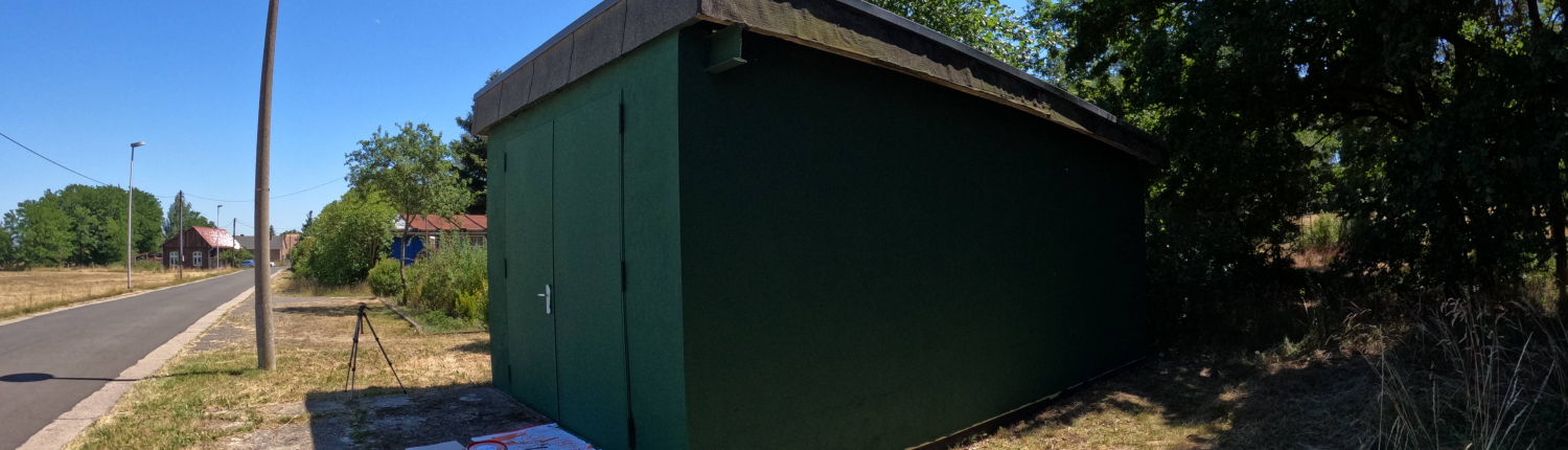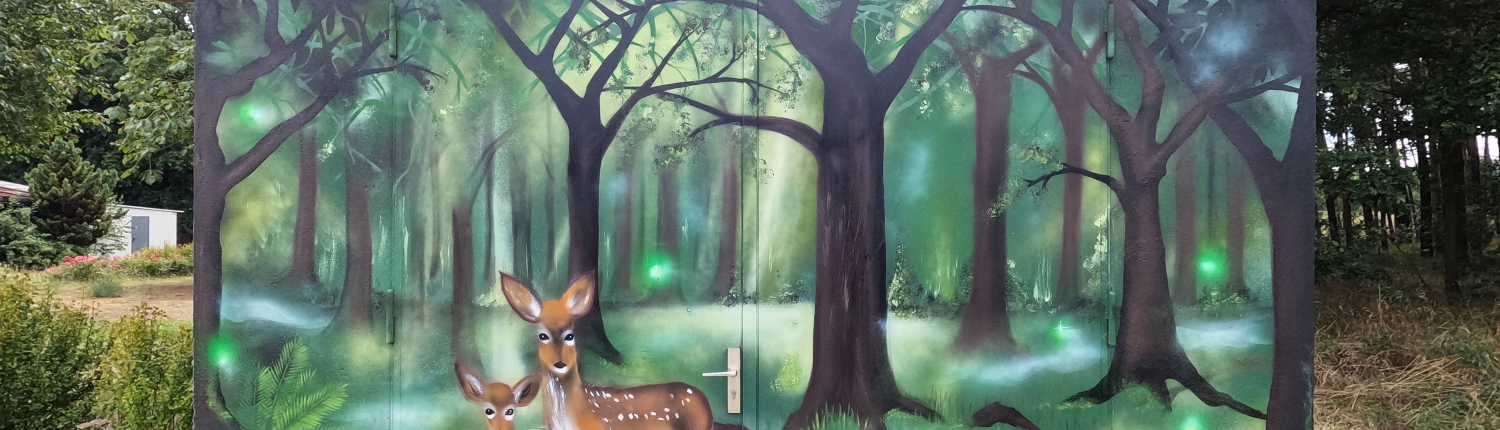 Kunst mit Herz zeigt eines seiner jüngsten Gestaltungsprojekte in Cottbus Maiberg. Etwas über den Stadtrand hinaus Richtung Spreeaue hinter Döbbrick liegt der kleine Ortsteil Maiberg. Im Zentrum war früher eine Schankwirtschaft, die so einige Geschichten zu erzählen hätte. Daneben befindet sich ein schöner Rastplatz mit Spielgeräten, sowie ein kleines Feuerwehrhäuschen. Dieses Häuschen wird von der Gemeinde genutzt und sollte nun verschönert werden. Nach ersten Gesprächen verging etwa ein Jahr bis es dann letztendlich soweit war. Es gab eine kleine Auswahl von Entwürfen, welche dann nach einer Abstimmung als Grundlage für die Gestaltung genommen wurden. Insgesamt 25 Arbeitsstunden stecken in diesem Projekt. Das Thema Spreewaldsagen wurde mit dem Irrlichtmacher in einem mystischen Wald aufgegriffen. Auch 2 Rehe zieren die Giebelseite und beobachten die Betrachter. Auf der Seite des Eingangsbereiches gab es eine klassische Spreewaldgestaltung mit Störchen und etwas Uferlandschaft. Vielleicht kommt Ihr ja mal daran vorbei!? Ich wünsche Euch nen schönen Restsommer und bleibt fresh 😉